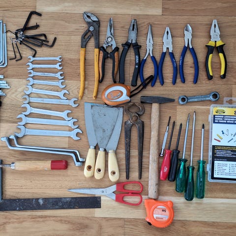 Verktøysett med tenger, skrutrekkere, målebånd og stålbørster
