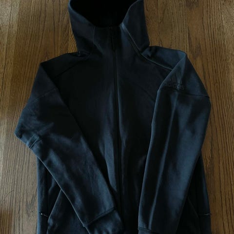 Adidas Performance Essentials hettejakke for menn i størrelse M. Jakken er marineblå med lyseblå og hvite striper på ermene, og har hette med snøring. Laget i materiale som egner seg for ulike sport- og fritidsaktiviteter.