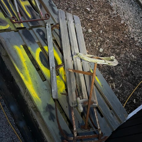 Sparkstøtting til barn gis bort. Er godt brukt, men med litt pussing av stål og kjærlighet på treverk så blir den brukbar.