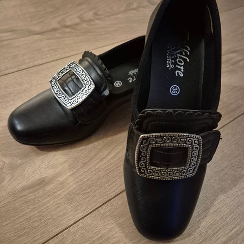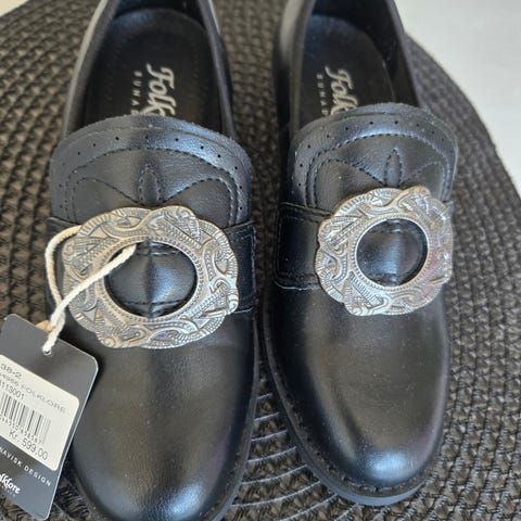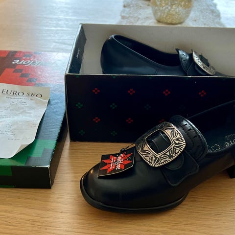 Bunadsko i skinn. De er kun prøvd på inne. Helhøyde 3-4 cm