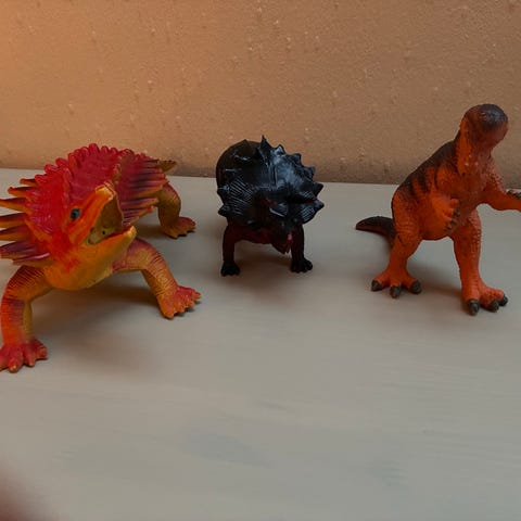 inneholder tre dinosaurleker laget av tre og annet materiale. Lekene inkluderer en grønn triceratops, en gul stegosaurus og en rød salamanderlignende figur. Passer som samlerobjekter eller som leketøy for barn.