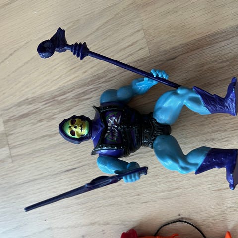 Mattel Masters of the Universe actionfigur av karakteren Skeletor i blå farge. Figuren har detaljerte muskler og bærer et sverd som tilbehør.