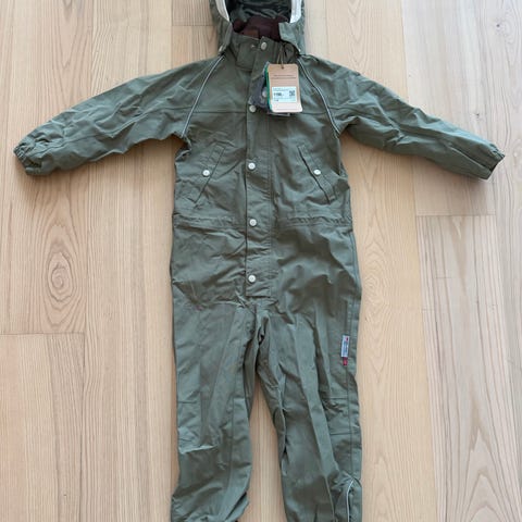 MINI A TURE høst / vårdress i størrelse 98, farge grønn. Plagget er designet for barn og har funksjoner som elastiske mansjetter og stropper under bena for bedre passform og komfort.