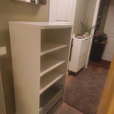 Montana reol hylle . Reolen har flere hyller og skuffer for oppbevaring, og er laget av slitesterkt materiale. Ideell for organisering av bøker, magasiner eller andre gjenstander i hjemmet eller kontoret.