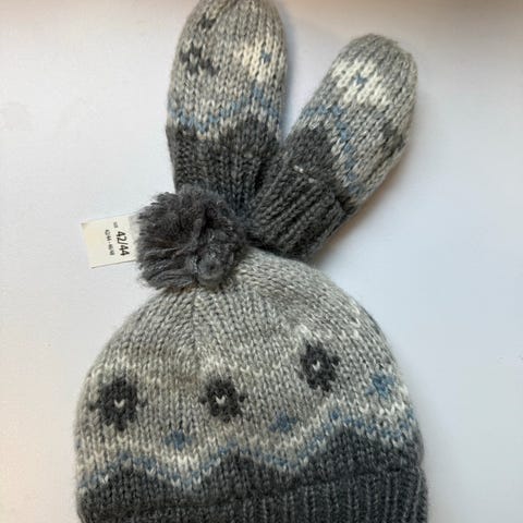 Grå og hvit foret lue, varm og god, Sfera Joven, med koselig motiv. ( 46 cm) 9 måneder