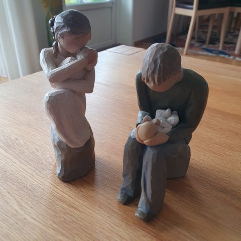 Jeg har flyttet fra hus til leilighet. Jeg har ikke lenger plass til alle tingene mine. Jeg selger disse Willow Tree figurene.