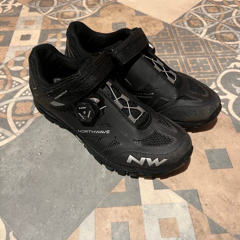Btwin sykkelsko størrelse 42 i svart farge. Egnet for sykling med justerbare borrelåsfester for god passform.