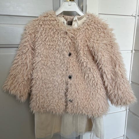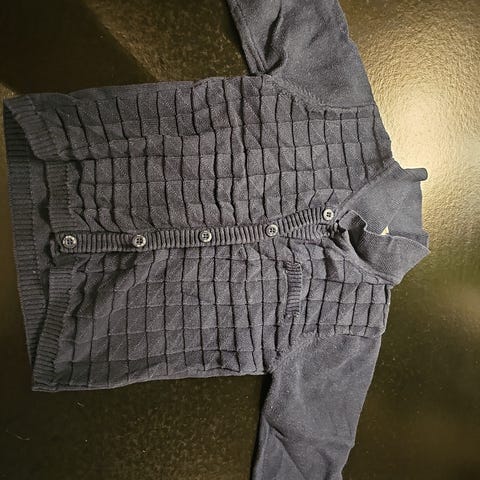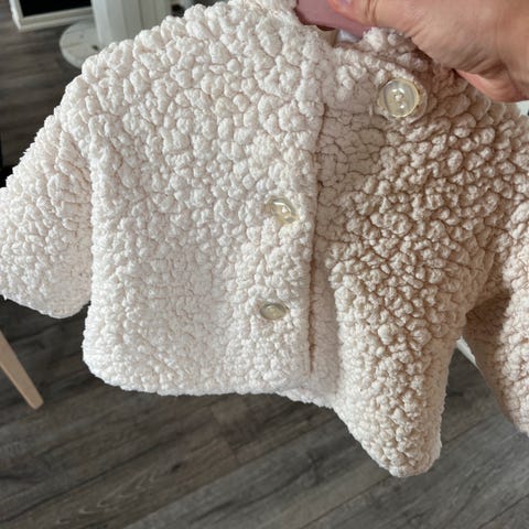 Selger en hvit jakke med mørkeblå prikker og skinnende pynteknapper.