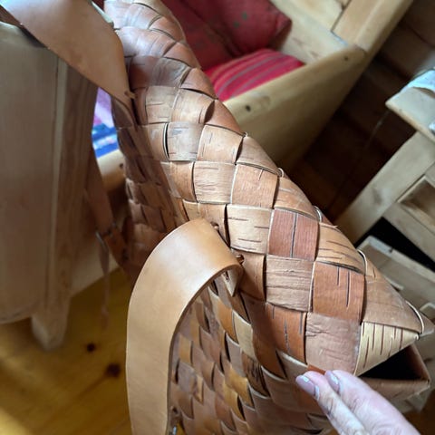 Meget pen håndlaget tine av tre. Diameter ca 13 cm, høyde ca 7 + hank.