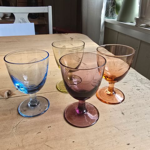 5 stk 60-talls vinglass fra Hadeland i serien Kikki. Design Willy Johansson. Grått stett. Pris pr glass. Noe bruksslitasje.