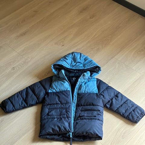 Vinterjakke i blå farge, størrelse 122, designet for gutter. Jakken har hette og flere lommer, egnet for barn i denne størrelsen. Pent brukt, hadde et lite hull som er reparert med Gore tex tape, selges for kr 60.