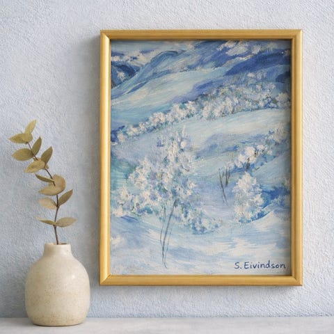 Skiltet har originale farger og signatur på baksiden: "Ingrid Eidjord, 1979".