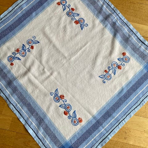 Duk med blått mønster, størrelse ca 78cm x 77 cm