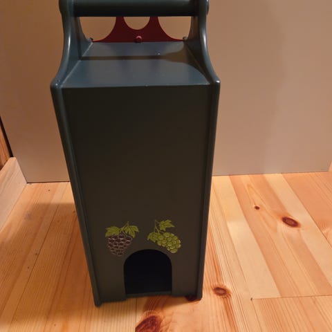 Til dekorativ servering av kartongvin eller til å ha stående på bord eller kjøkkenbenk. Den har en åpning på siden som er tilpasset tappekranen på kartongvin.