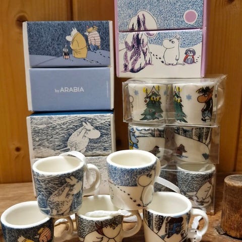 Mummi minikrus , Arabia, nye og ubrukte. Produktet er designet i Finland og produsert i Thailand. Fin pynt til f.eks. juletre. Har esker med 4 krus i hver, fra år 2011, første års utgivelse av minikrus : 700 kr. Og 2012, her mangler etikett : 600 kr. Og 2021: 350 kr. Har flere av hver fra disse årgangene.