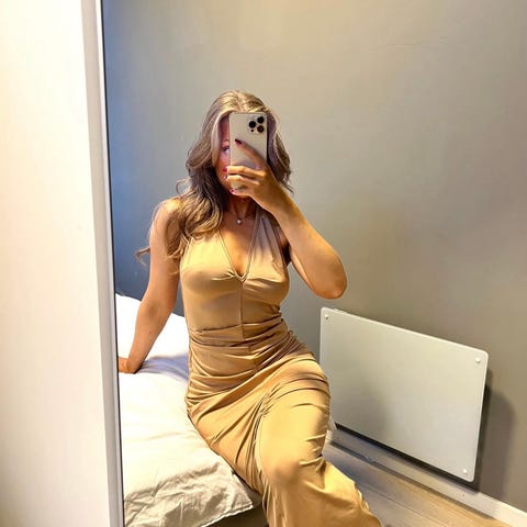 Kjempefin og funky gullkjole i stretchy gullstoff. Fint snitt og påsydd belte som kan brukes framme eller bak på ryggen. Perfekt til julebordet 🌟👌 den er stor i størrelsen, tipper 2XL eller 3XL. Merke: ELOQUII