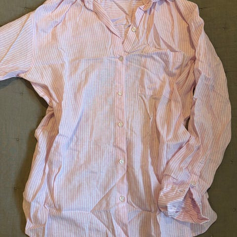 H&M lang skjorte i størrelse 36 for kvinner. Skjorten har rosa og hvite striper og er laget av 100% bomull. Den har knappestolpe foran og krage. Aldri vært brukt!