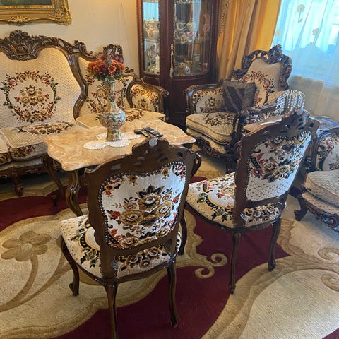 Elegant vintage sofagruppe bestående av 3-seters sofa, 2 stoler, bord + 1 lenestol. Meget god sittecomfort (dunputer).