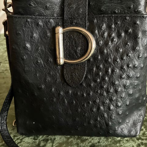 Unik og stilig crossbody veske i svart skinn. Den har en luksuriøs tekstur som etterligner strutseskinn, og er et klassisk tillegg til enhver garderobe. Skulderreimen kan justeres. I lommen på fremsiden er det plass til kort. I god stand, med vanlig bruksslitasje.
