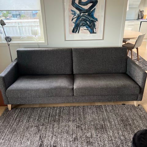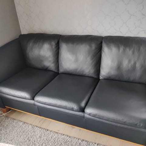 Fint brukt sofa. Må bæres ned fra 2 etg. 2 st små flekker, se bilde. Trekkene kan tas av og vaskes.