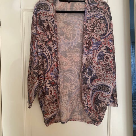 Jakke med flerfarget mønster i størrelse M for kvinner. Jakken har knappelukking og lommer. Egnet for hverdagsbruk og kan kombineres med ulike antrekk. Aldri brukt.