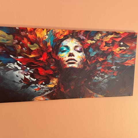 Stort og stilfullt kunstbilde trykt på lerret (120x85 cm). Motivet viser en elegant figur i sort-hvitt med metallisk glans – perfekt for å gi et moderne og eksklusivt preg til stue, kontor eller klinikk.