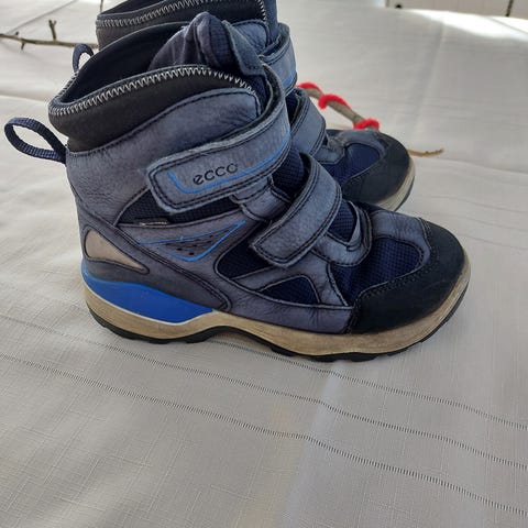 ECCO barn sko i størrelse 34, designet for gutter. Skoene har en kombinasjon av sort og blå farge, med borrelås for enkel justering og påkledning. Yttersålen har godt grep, egnet for aktiv bruk.