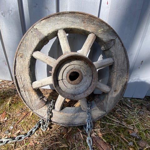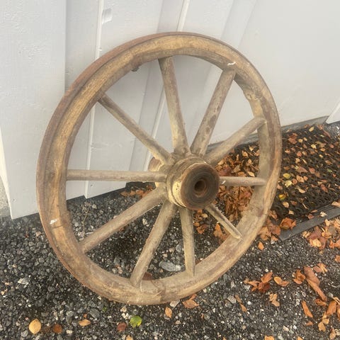 Ukjent merke trehjul laget av tre med metallbånd rundt ytterkanten. Hjulet har en aksel og åtte eiker. Kan være en del av en eldre vogn eller maskin. Passer til dekorasjon eller restaurering av antikke gjenstander.