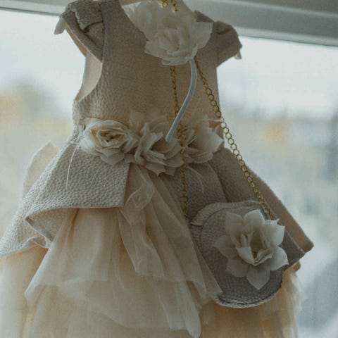 Selger en hvit pen kjole. Følger med bånd i nydelig grønn farge, denne sitter ikke fast og kan derfor byttes til andre farger. Den hvite sløyfen sitter fast på kjolen.