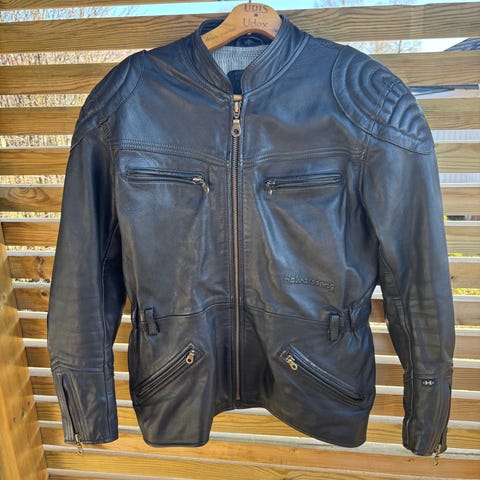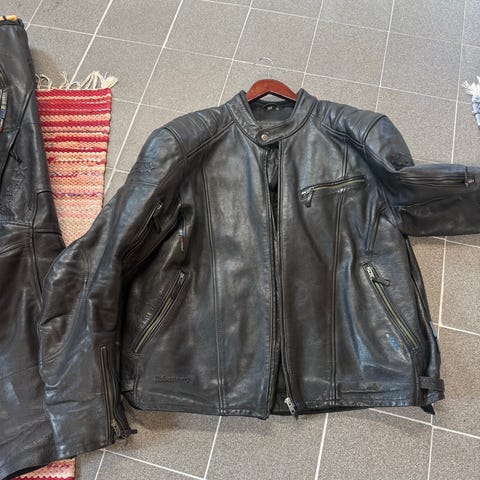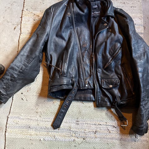 Tøff retro. Halvaesson MC- Skinnjakke for herre i svart. Polstringer på albuen og skuldre som kan tas ut. Lufting via glidelås foran og bak. Synlig brukt, men smurt jevnlig, nesten uslitelig.
