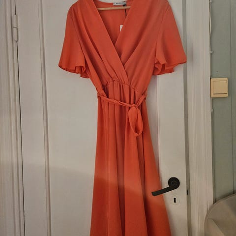 Lekker aprikosfarget kjole som er like fin til hverdags som til fest. Denne har sommerfuglermer som skjuler det man ikke vil vise på overarmene.