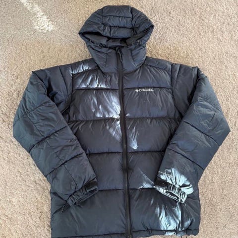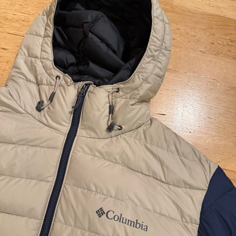 Columbia Jakke i beige farge, størrelse L for menn. Jakken er designet for utendørs bruk og gir komfort og varme.