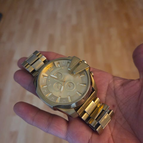 Diesel herreklokke i stål med analog urskive og kronograffunksjoner. Klokken har en robust lenke i metall og en rund urskive med tydelige markeringer. Egnet for daglig bruk og formelle anledninger.