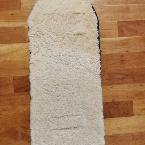 Lammeskinn til å ha som underlag i vogn med hull til seler.