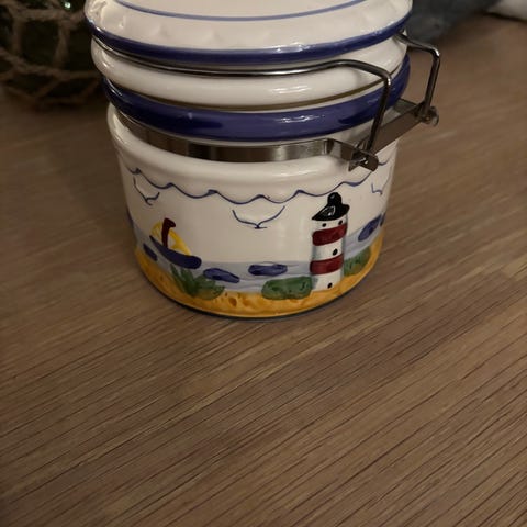 Krukken er uten skader, men mangler lokket. Den kan brukes som en blomsterpotte til en liten blomst. Jeg kan sende med fiks ferdig.