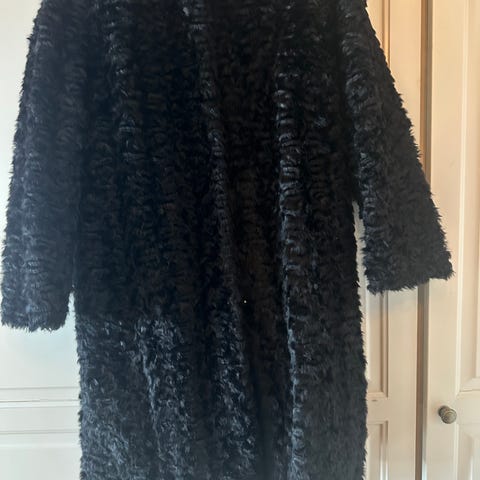 Aleksander of Norway kåpe i størrelse XL for damer. Fuskepels og fargen er svart. Jakken har et mykt og strukturert materiale, og innvendig for. Lite brukt. Kragen kan enten kneppes helt opp eller brettes ut.