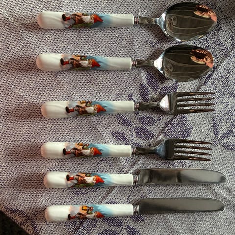 Har nå 8 kniver, 16 spiseskjeer, 13 gafler og 11 dessertskjeer
