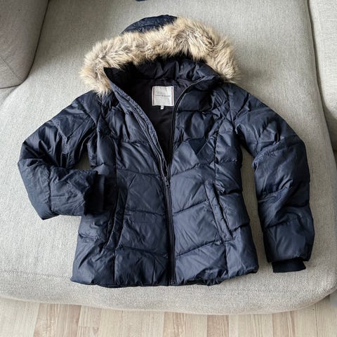 Tommy Hilfiger vinterjakke i størrelse L/G (12-14). Jakken er grå med hette og har en fôret innside i lilla fleece. Materialet er egnet for kalde værforhold og gir god isolasjon. Jakken har glidelås og knapper i front, samt lommer. Hetten kan tas av og pels på hetten er også avtagbar. Lite brukt. Ingen bruksmerker.