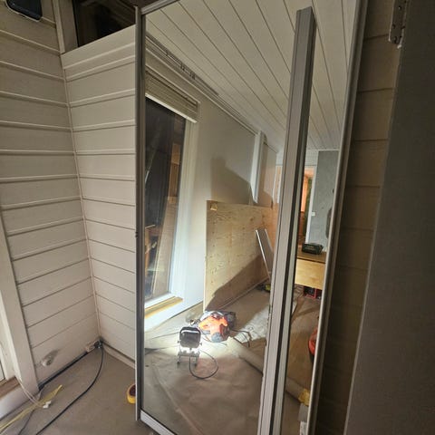2 nye skyvedører type Elfa Grace hvit selges. Bredde 699 mm og høyde 2330 mm. Passer til takhøyde ca 240 cm. To bittesmå transportskader som knapt er synlig