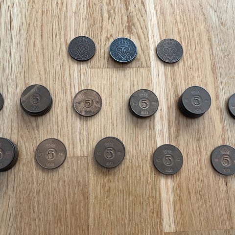Rett før større penge- og myntreformer. Småvalører mistet kjøpekraft og betydning.