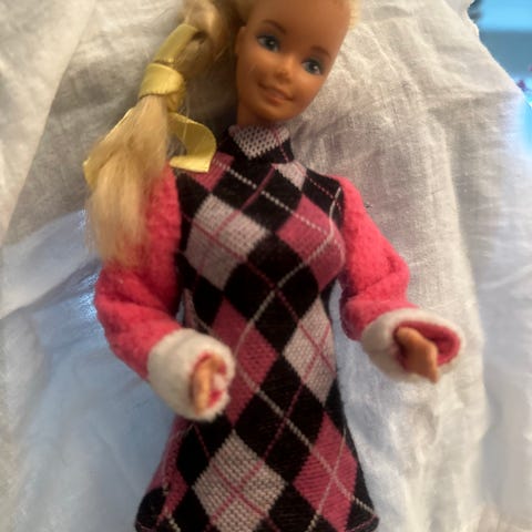Trolig fra 70-tallet. Myk kropp med fint mønster og ansikt i plast. Den ser hel ut og uten store skader, men vil forekomme noen bruksmerker.