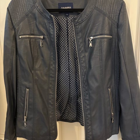 Selger denne jakken i imitert skinn i str M, men kan også passe en S.