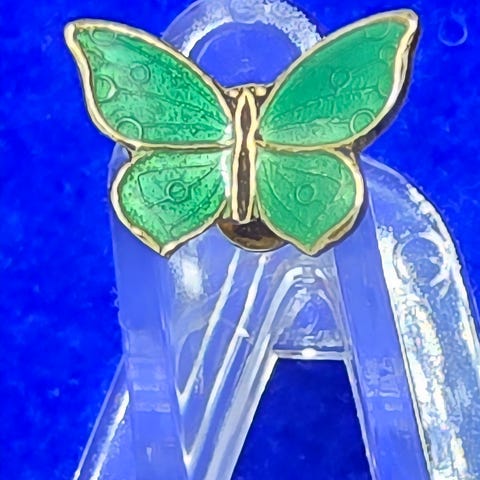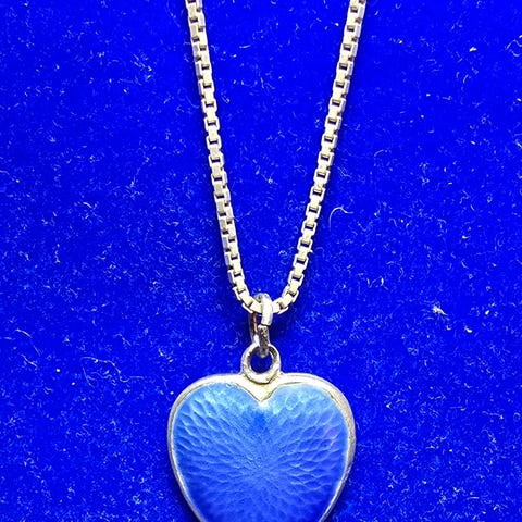 Nydelig hjerte i sølv og emalje selges for 400 kr. Måler 1,5 cm tvers over. Stemplet 925 og sterling, og et mestermerke. I god stand.