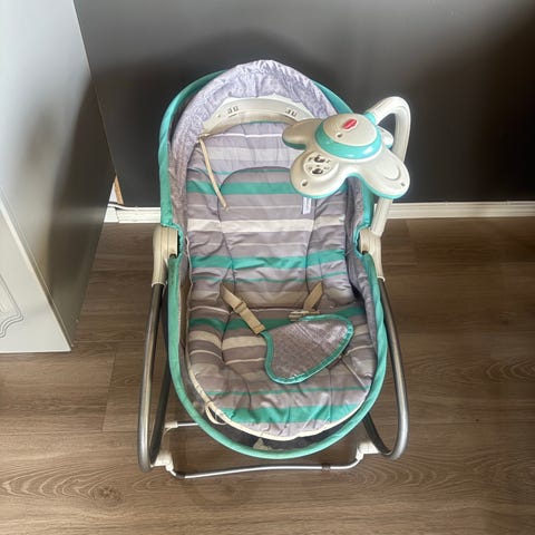 Chicco barnestol med integrert 5-punkts sikkerhetssele. Stolen har en polstret, lys innvendig del og mørk ytterstoff. Den er utstyrt med en avtagbar leke med myke figurer festet til håndtaket. Stolen har et solid, svart metallunderstell som kan foldes sammen for oppbevaring. Passer for små barn og kan brukes til å legge og hvile.