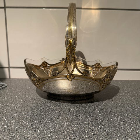 Serveringsfat med glassfat og sølvplettramme med dekorativt håndtak. Fatet er delt inn i fire seksjoner, egnet for servering av småretter eller snacks. Materialene inkluderer klart glass og metall med sølvfarget finish. Passer til bruk ved servering og presentasjon av matvarer.