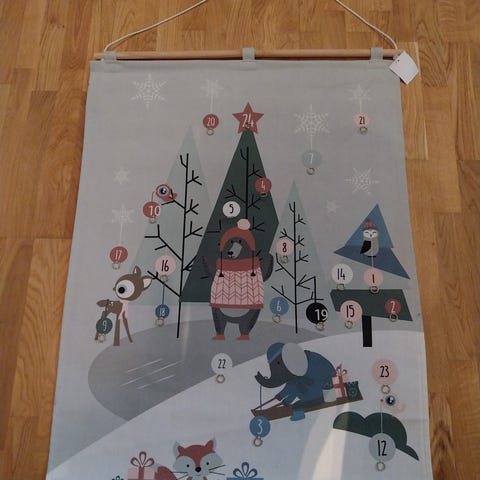 Vakker Ubrukt håndbrodert stor pakkekalender med beslag. Flere nissemotiver brodert i små korssting på lys blå aida. Påsydde røde plastringer. Blått beslag. Påstrøket viselun på baksiden. Lengde uten beslag 72 cm. Bredde 28 cm. Røyk- og dyrefritt. Glemt bort. Selger kr. 1.890,-. Tar vipps. Sender + porto Norgespakke 76/PostNord 69.