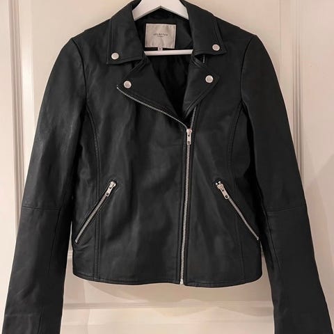 Tøff og fin svart jakke i skinn / bikerjakke fra Mango i str: M. Jakken har glidelåslommer foran og glidelåsdetaljer på ermene. Pent brukt. Kan hentes i Oslo eller sendes. Kjøper betaler porto.