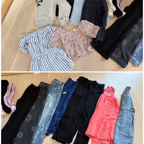 Klespakke jente str 134-140. Noen av plaggene er i str 146 men små i str, gjelder sort singlet og den lyseblå kjolen