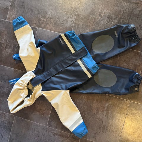 Reflex regnjakke og regnbukse i størrelse 104, selges billig siden buksen er litt slitt (se bilde)
