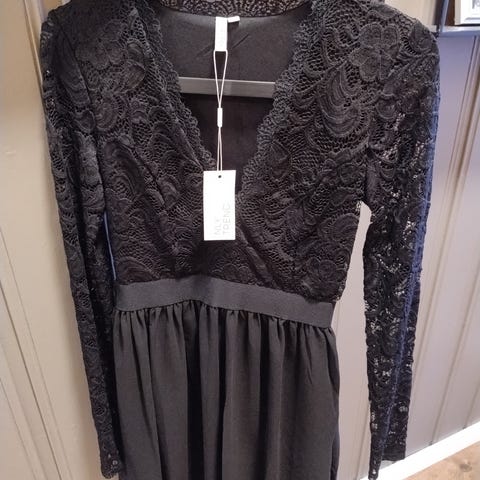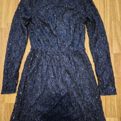 Nelly festkjole i blå farge, størrelse 34. Kjolen har tynne stropper og er laget av glatt stoff med en glidelås i ryggen. Høy splitt. Dessverre revnet litt øverst i splitten, men den kan lett sys. Passer til formelle anledninger.